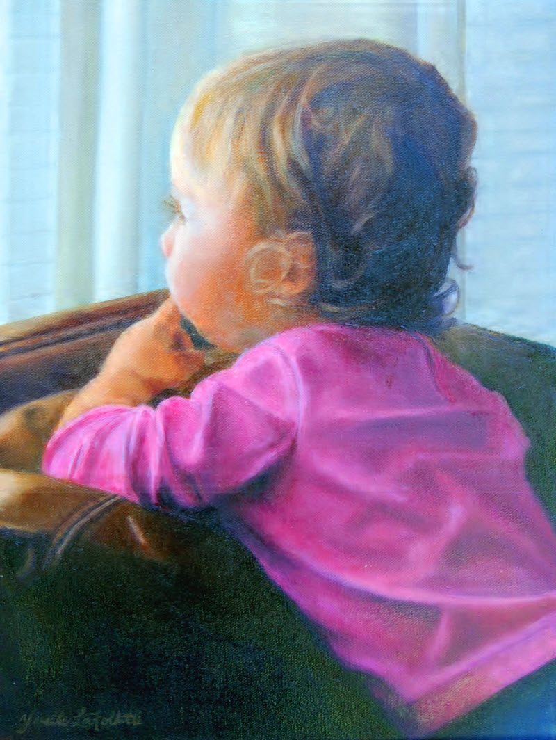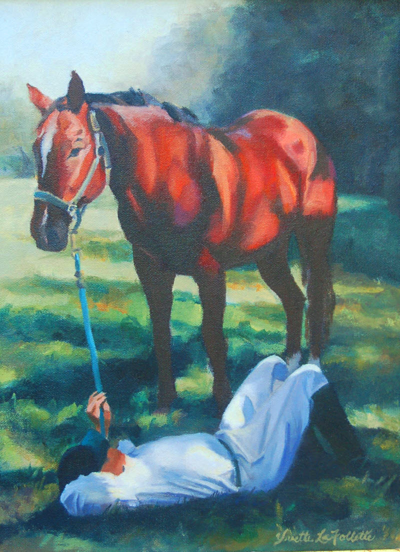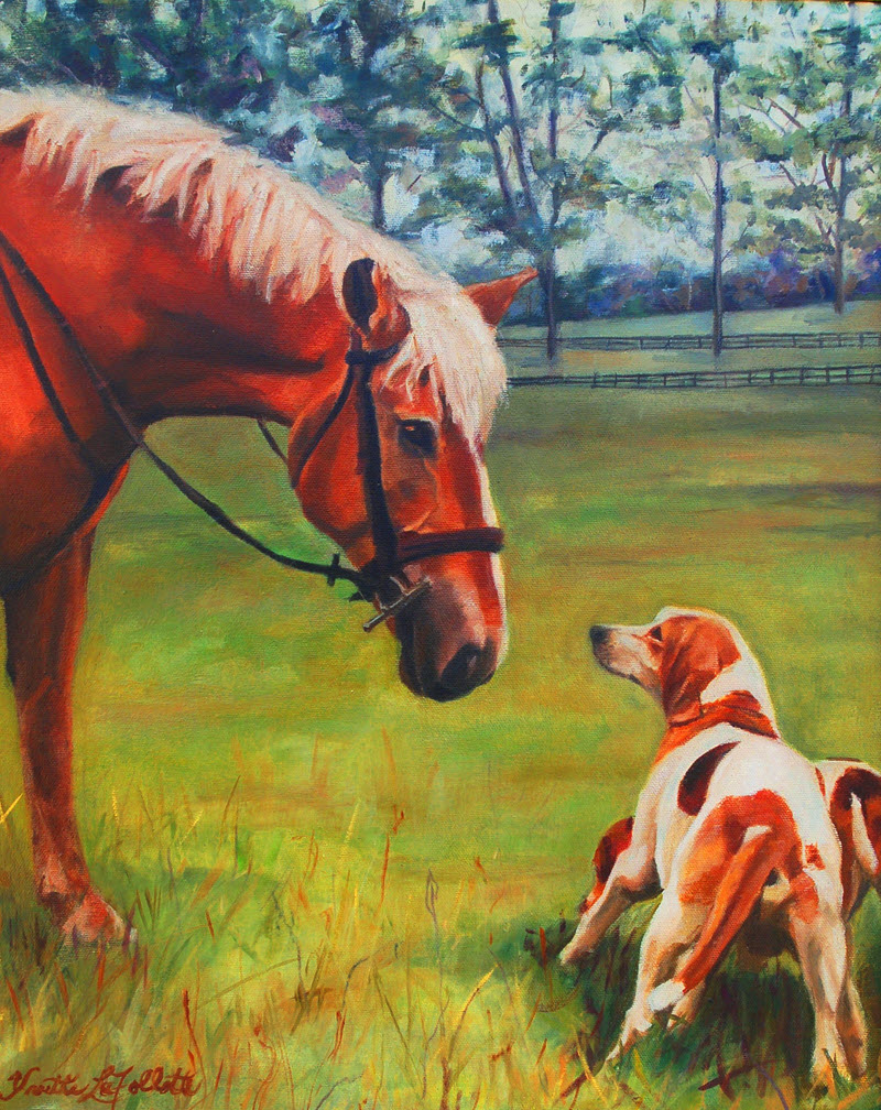 Her painting, “The Winner” was selected from 13,000 entries as a finalist in the Artist Magazine’s 2001 Annual Art competition and “Pure Exhaustion” was a chosen from 8,000 entries as a finalist in 2007’s competition. In addition, The Cincinnati Magazine listed her as one of the five portrait artists recommended to their readers. Her painting “Gossiping” was exhibited in the prestigious American Academy of Equine Arts Fall 2000 Showcase of Equine Art and “Where’s the Fox” was selected for Art Show at the Dog Show in Wichita, Kansas in 1999. “My Shadow & Me” won an award in the 2002 Viewpoint Art Show and “Coming & Going” won an Honorable Mention in the LSU International Exhibition of Animals in Art in 2002. She has also exhibited in several ViewPoint juried shows sponsored by the Cincinnati Art Club. Her paintings “Pillow Talk” and “Bridget” were selected for the 2012 Art Project at Bethesda North Outpatient Imaging and Mary Jo Cropper Center for Breast Care. They were displayed for one year.